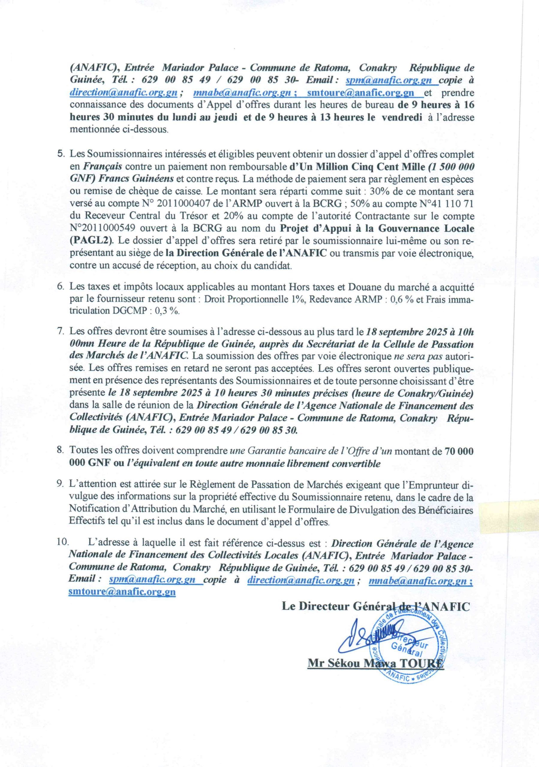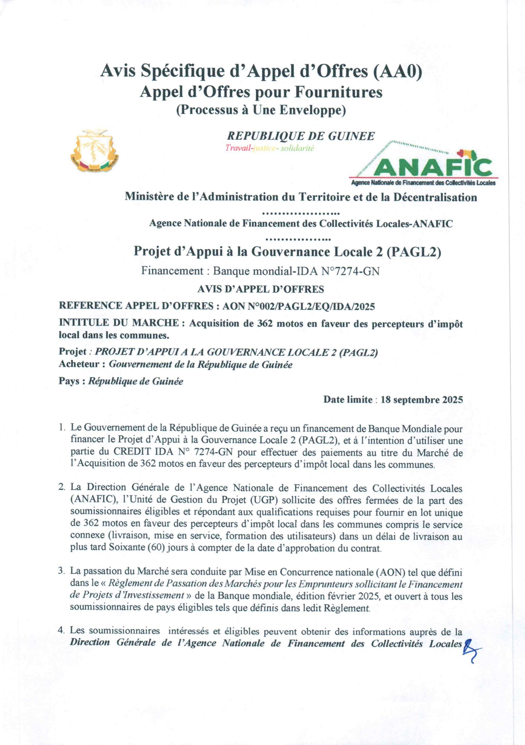 ANAFIC – Appel d’offres pour l’acquisition de 362 motos en faveur des Percepteurs d’Impôt local dans les Collectivités Locales