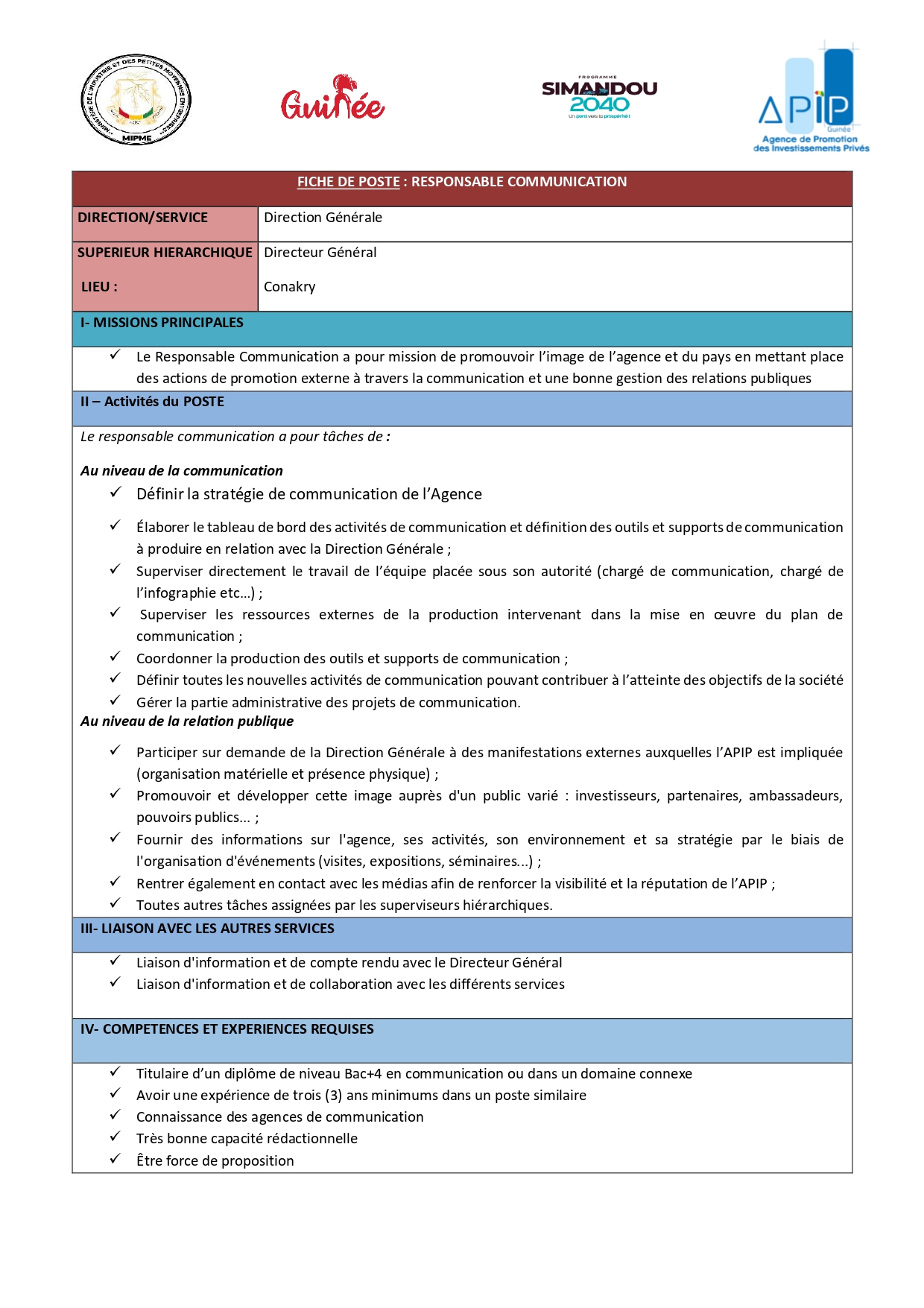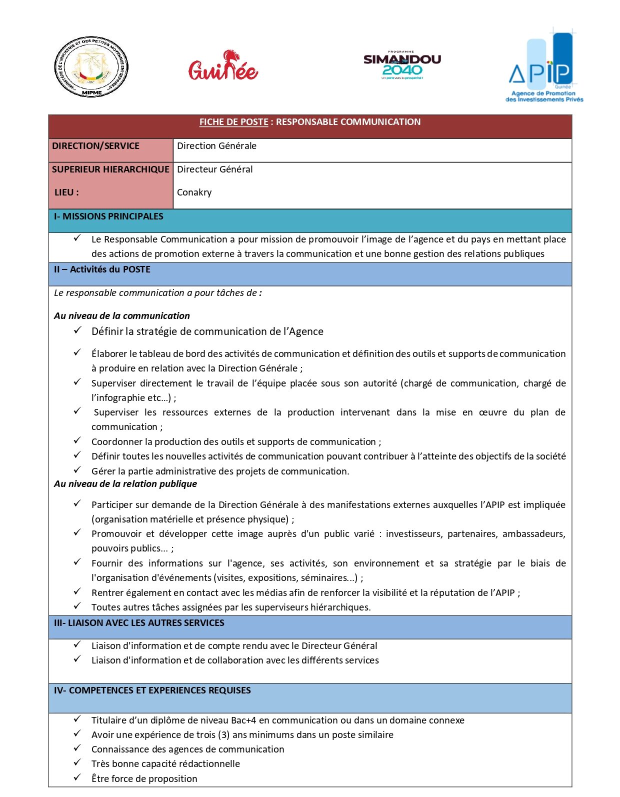 Offres d'emplois APIP GUINEE – Avis de recrutement d’un Responsable Communication Partager FacebookLinkedinWhatsAppTwitter Publié par Journal 224business 15 janvier 2026 0 Date limite: 23 Janvier à 14h:00 224business - Advertisement - - Advertisement - - Advertisement - Plus d'offres CRS – Avis de recrutement d’un spécialiste Laboratoire Journal 224business - 19 janvier 2026 APIP GUINEE – Avis de recrutement d’un Chef de département Appui aux Entreprises Journal 224business - 15 janvier 2026 Date limite: 23 Janvier à 14h:00 Avis de recrutement d’un.e Commercial Expérimenté (H/F) Journal 224business - 13 janvier 2026 Dans le cadre du renforcement de son équipe, une société de la place nous recrute un(e) Commercial(e) motivé(e) et orienté(e) performance, disposant d’au moins... Voir plus