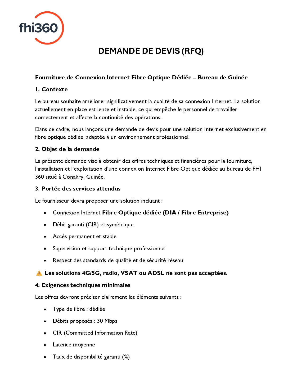 Fhi360 – RFQ pour la fourniture de connexion internet Fibre Optique Dédiée – Bureau de Guinée