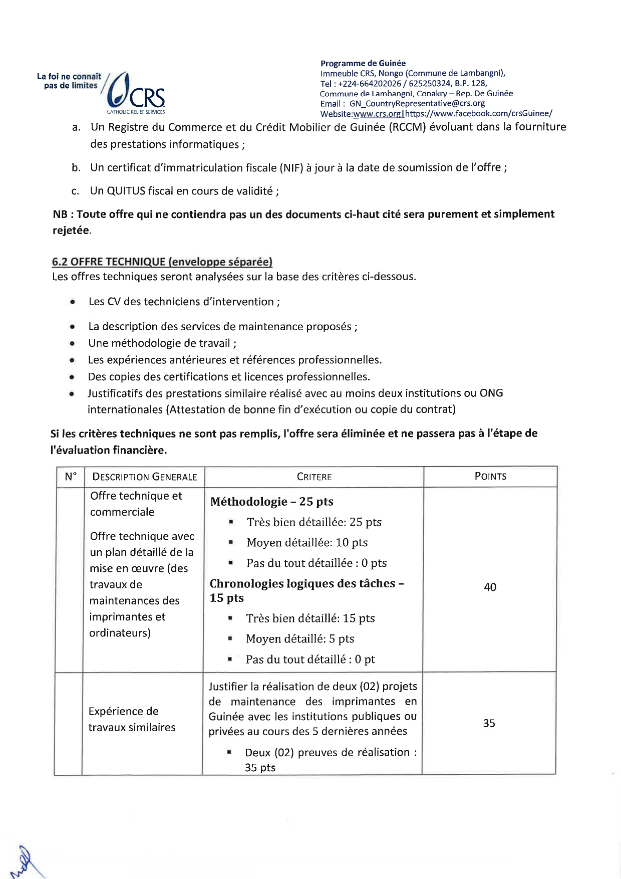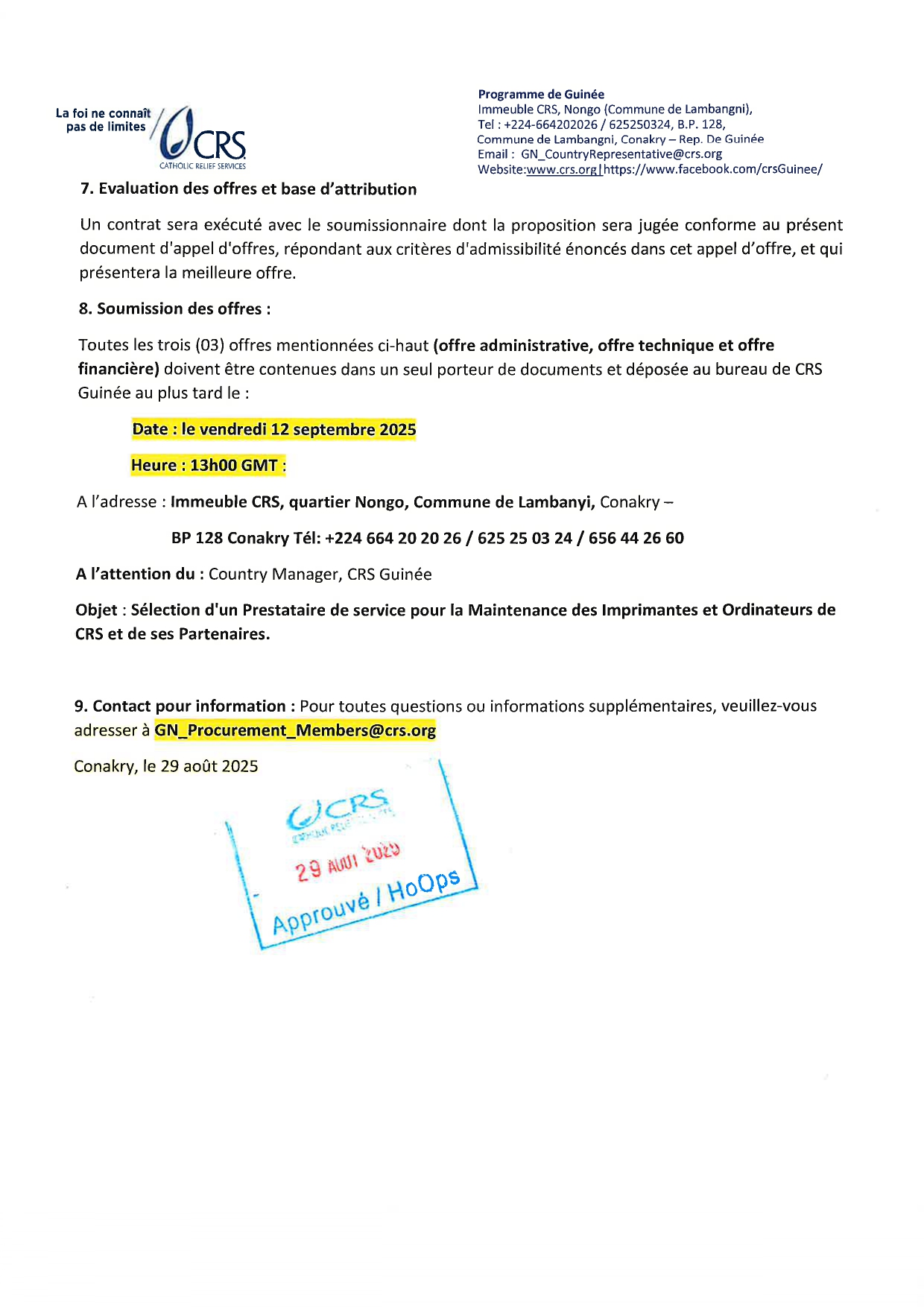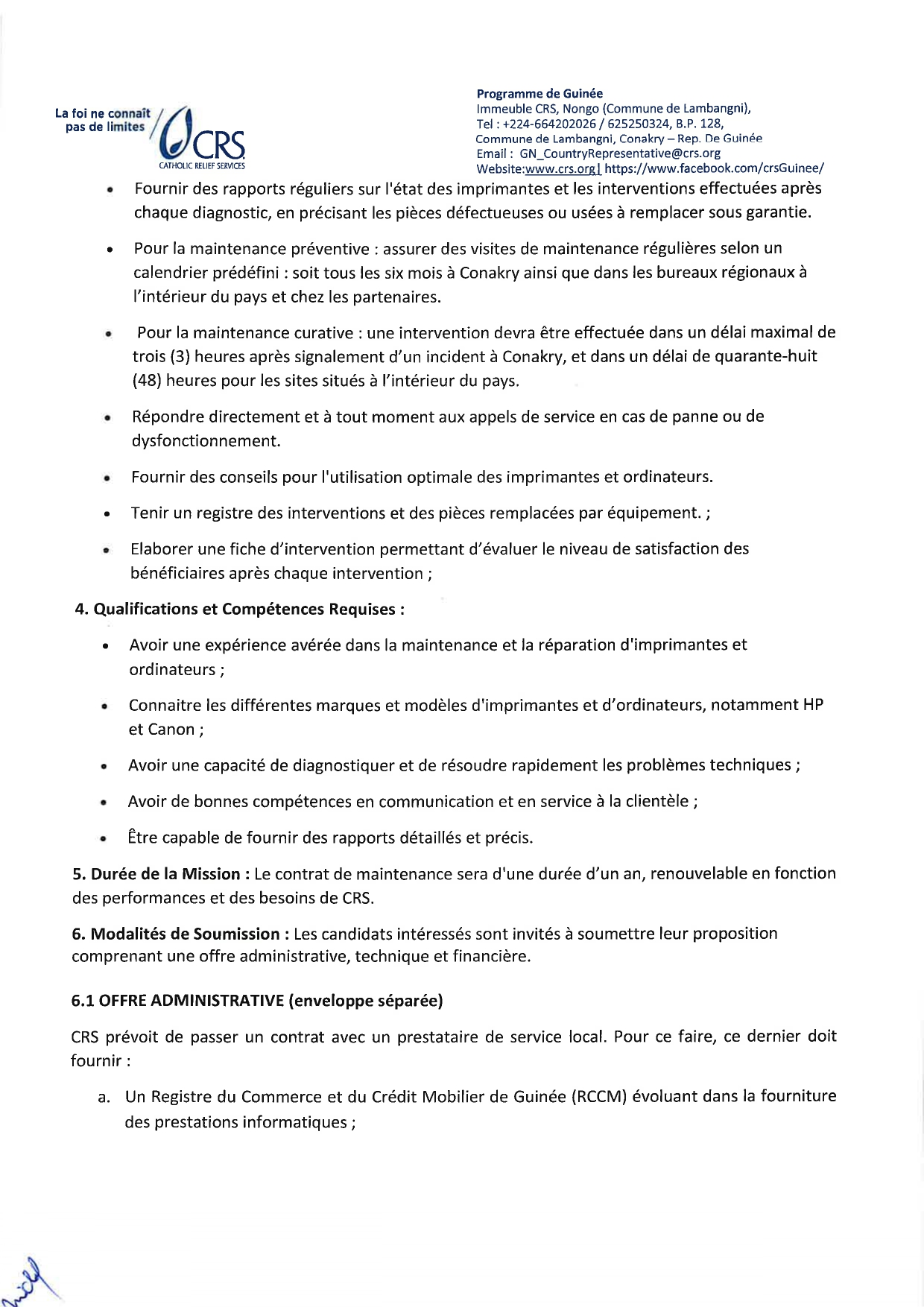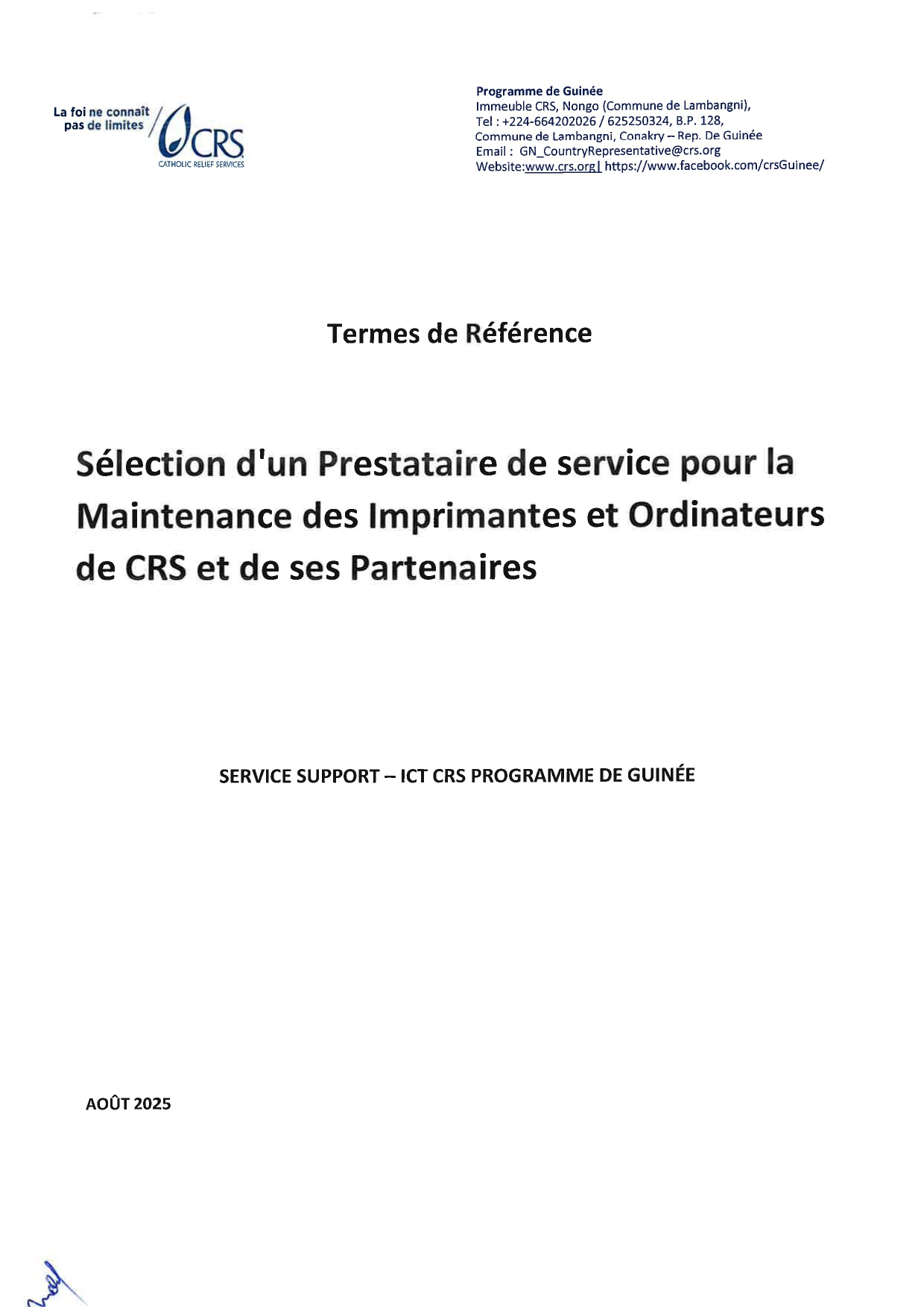 CRS – Avis de publication pour la selection d’un prestataire de service pour la Maintenance des Imprimantes et Ordinateurs de CRS et de ses partenaires