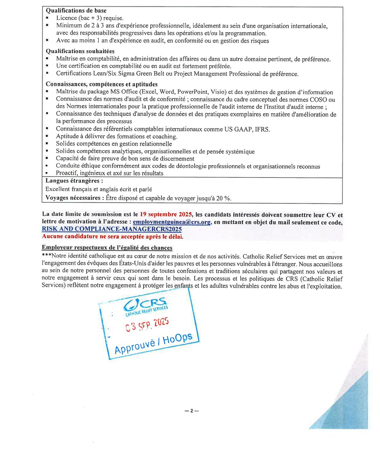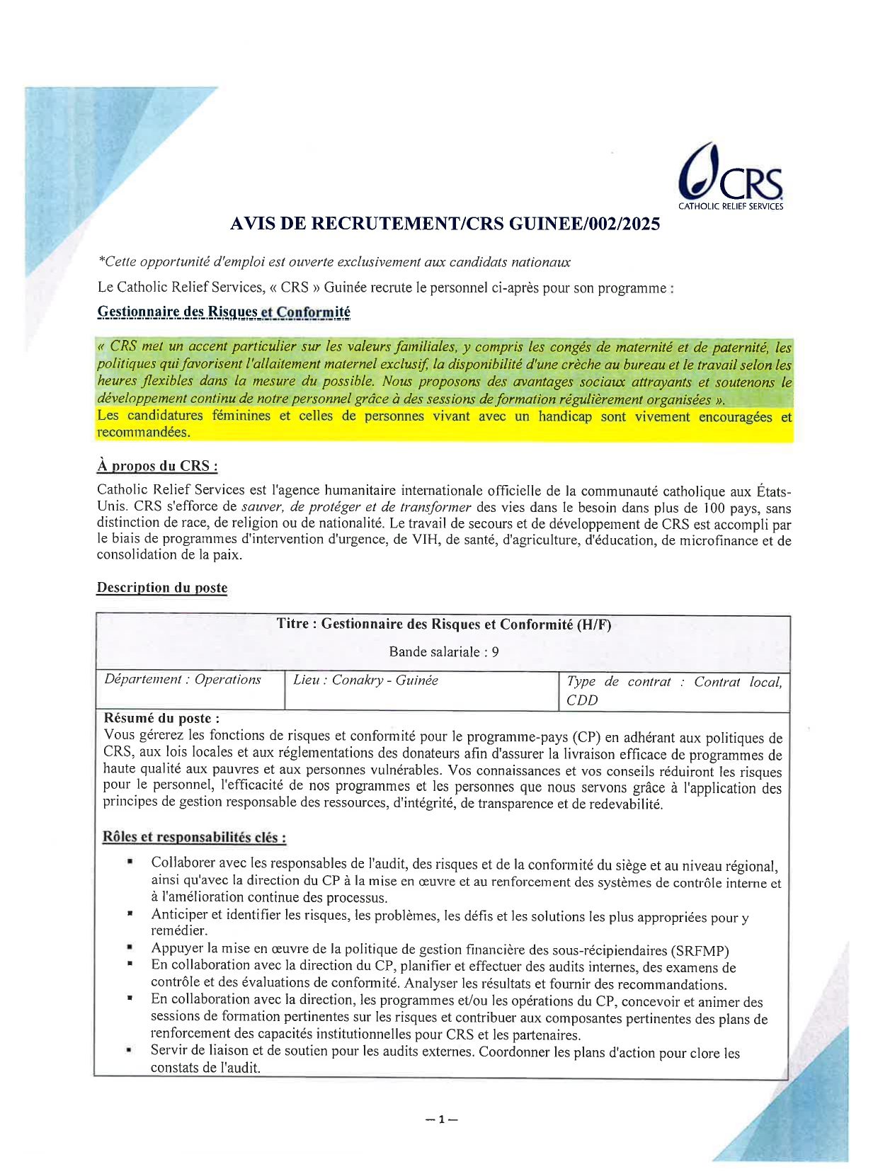 CRS – Avis de recrutement d’un Gestionnaire des Risques et Conformité