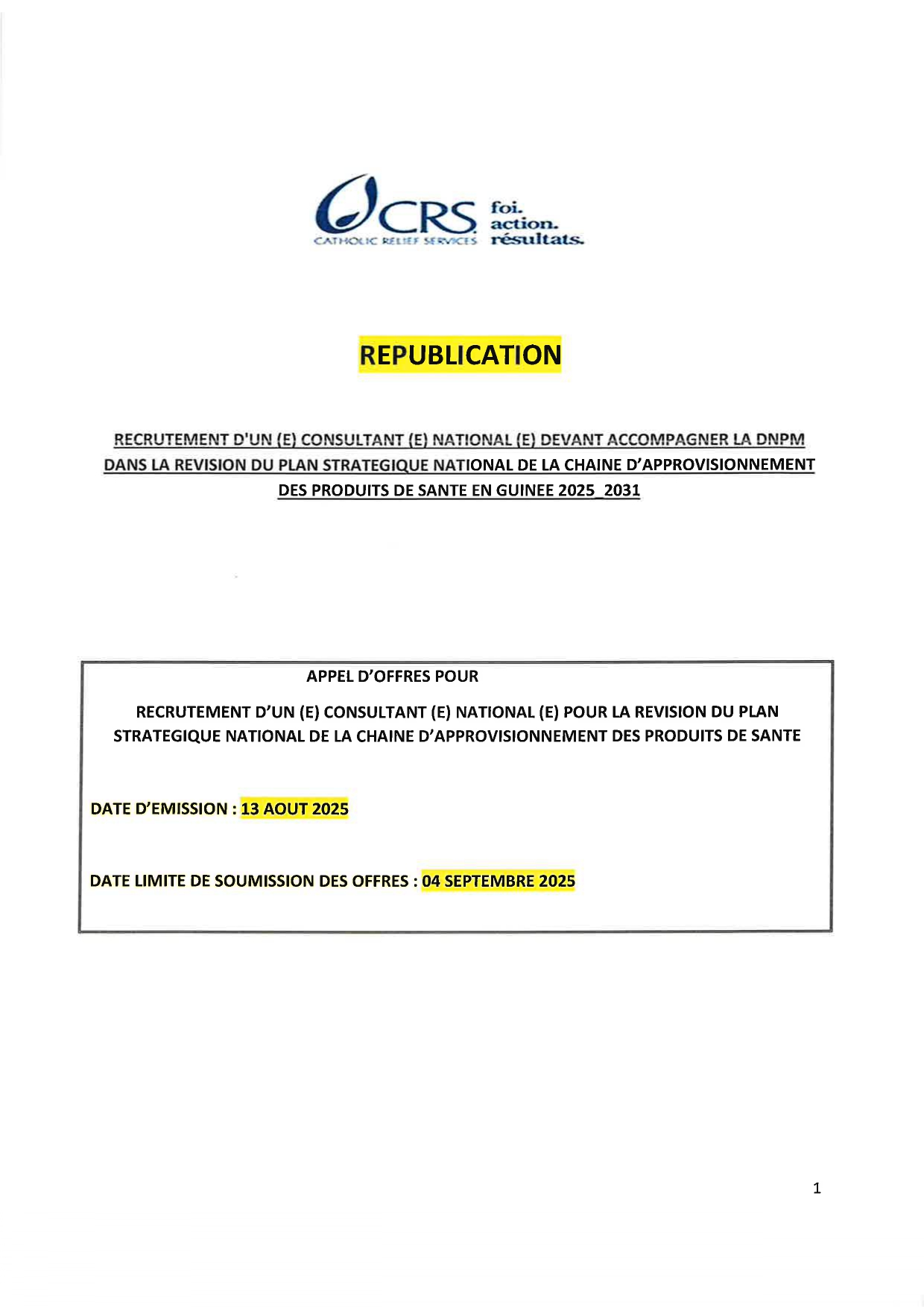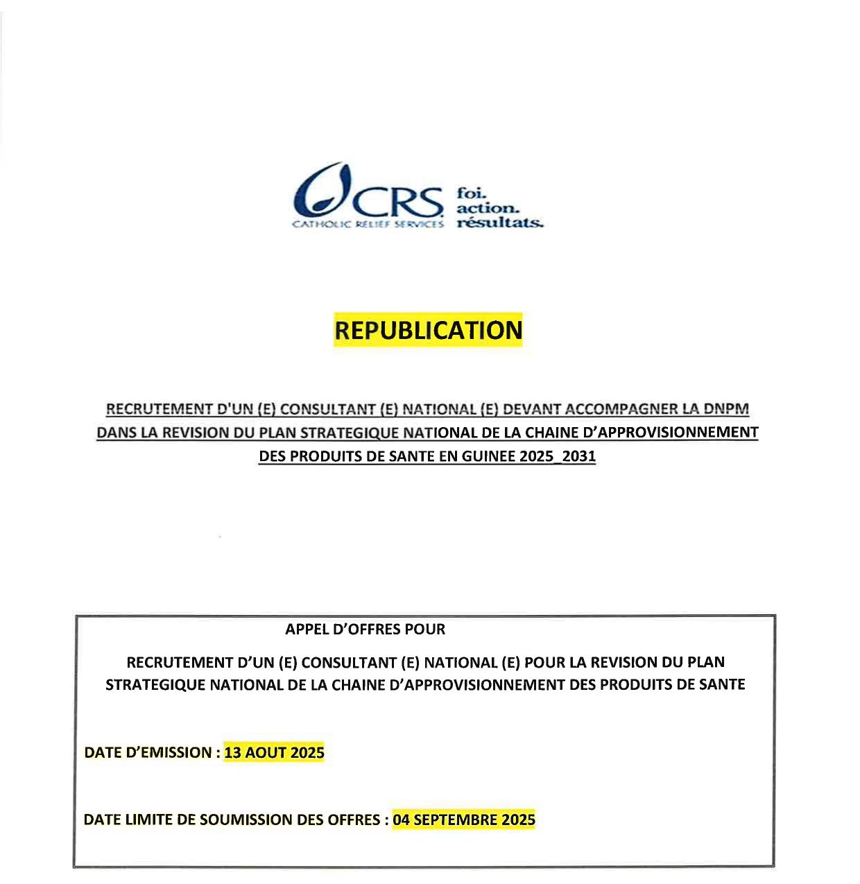 CRS – Avis de republication pour le recrutement d’un(e)Consultant(e) devant accompagner la DNPM dans la revision du plan strategique national de la chaine d’approvisionnement des produits de santé en Guinée 2025