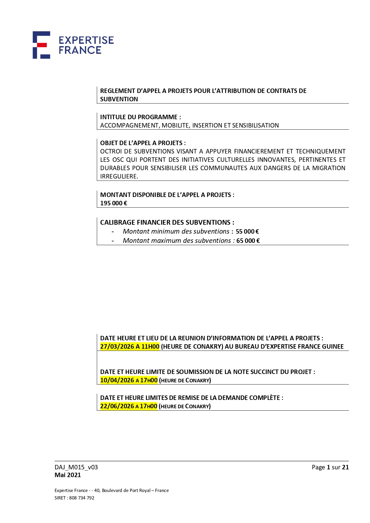 Expertise France – Avis d’appel à projet pour l’octrois de subventions aux OSC porteuses d’initiatives culturelles innovantes, pertinentes et durables pour sensibiliser les communautés aux dangers et risques de la migration irrégulière et de la TEH en république de Guinée.