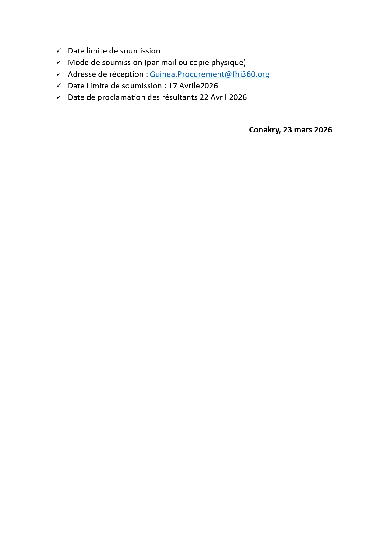 FHI 360 – Appels d’offres pour la mise en place d’un système de transport d’urgence communautaire autour des 25 structures SONUB (Soins Obstétricaux Néonataux d’Urgence de Base) dans les régions de Faranah et de Nzérékoré