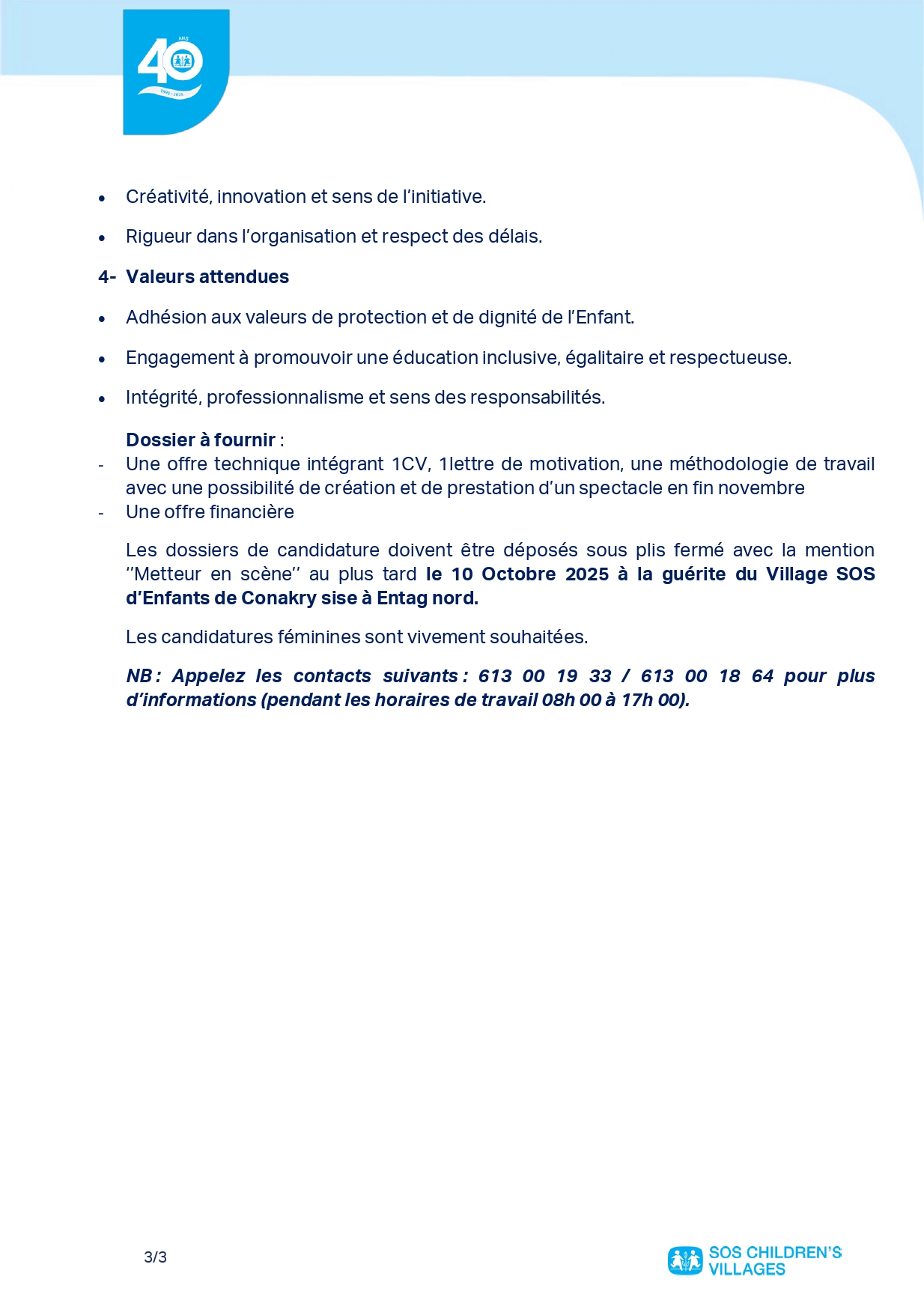 Offres d'emplois SOS Villages – Avis de recrutement d’un prestataire ‘’Metteur en scène’’ pour la mise en place d’une Troupe de théâtre pour Enfants au Village d’Enfants SOS de Conakry Partager FacebookLinkedinWhatsAppTwitter Publié par Journal 224business 25 septembre 2025 0 224business - Advertisement - - Advertisement - - Advertisement - Plus d'offres Santé Intégrée – Avis de recrutement d’un(e) Spécialiste Communication pour le Changement de Comportement Social Journal 224business - 23 janvier 2026 Sante Integree – Avis d’appel d’offre pour le recrutement d’un Consultant Expert en décentralisation et Financement de la Santé Journal 224business - 23 janvier 2026 CRS – Avis de recrutement d’un spécialiste Laboratoire Journal 224business - 19 janvier 2026 Voir plus