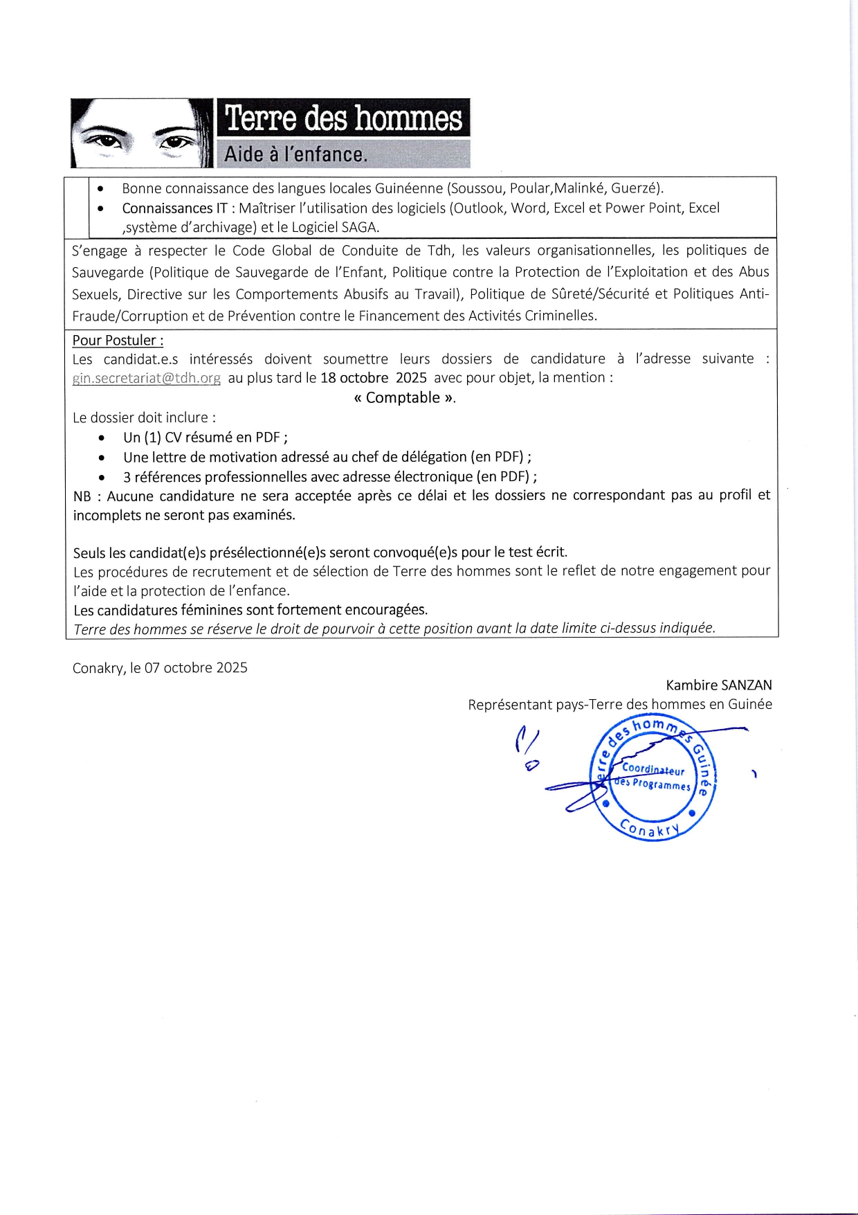 Offres d'emplois Terre des Hommes – Avis de recrutement d’un.e Comptable Partager FacebookLinkedinWhatsAppTwitter Publié par Journal 224business 9 octobre 2025 0 224business - Advertisement - - Advertisement - - Advertisement - Plus d'offres Santé Intégrée – Avis de recrutement d’un(e) Spécialiste Communication pour le Changement de Comportement Social Journal 224business - 23 janvier 2026 Sante Integree – Avis d’appel d’offre pour le recrutement d’un Consultant Expert en décentralisation et Financement de la Santé Journal 224business - 23 janvier 2026 CRS – Avis de recrutement d’un spécialiste Laboratoire Journal 224business - 19 janvier 2026 Voir plus