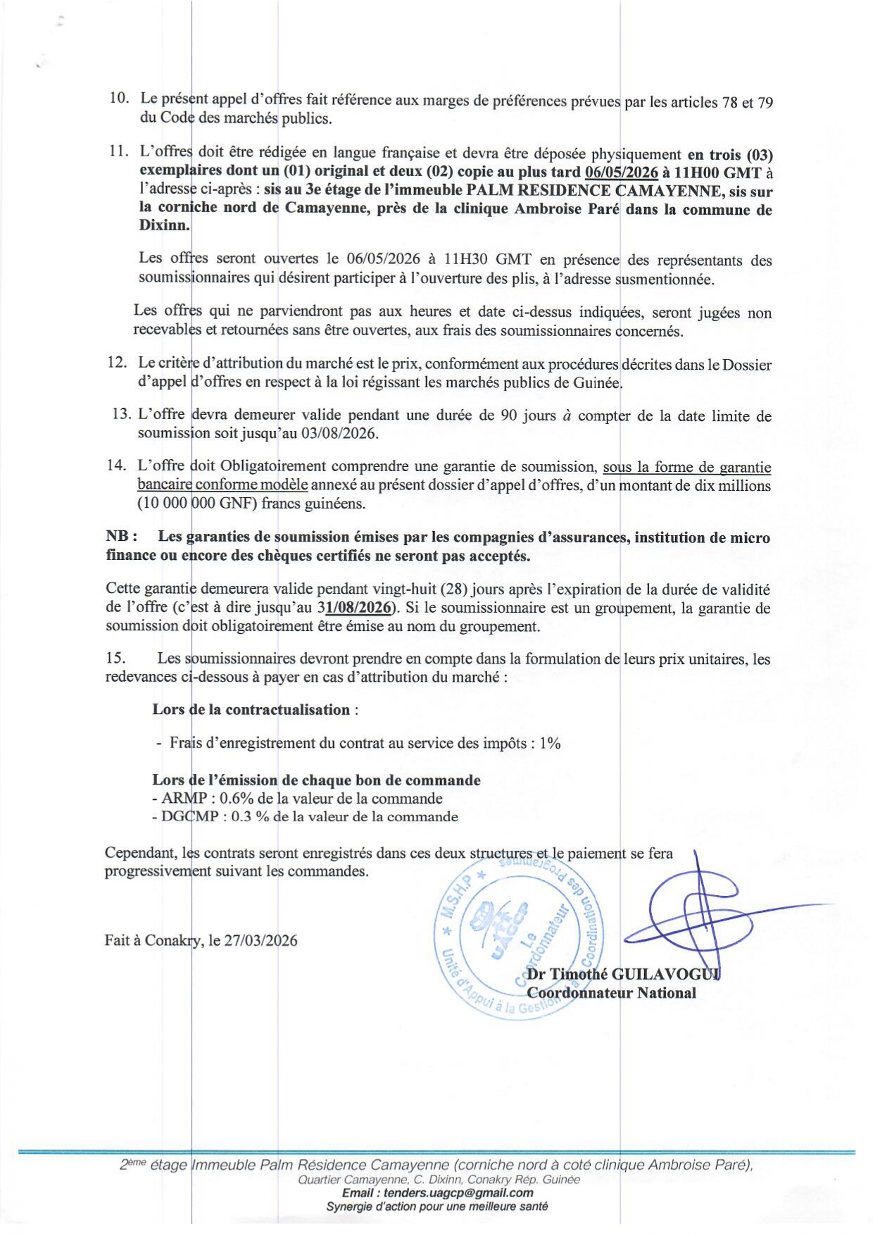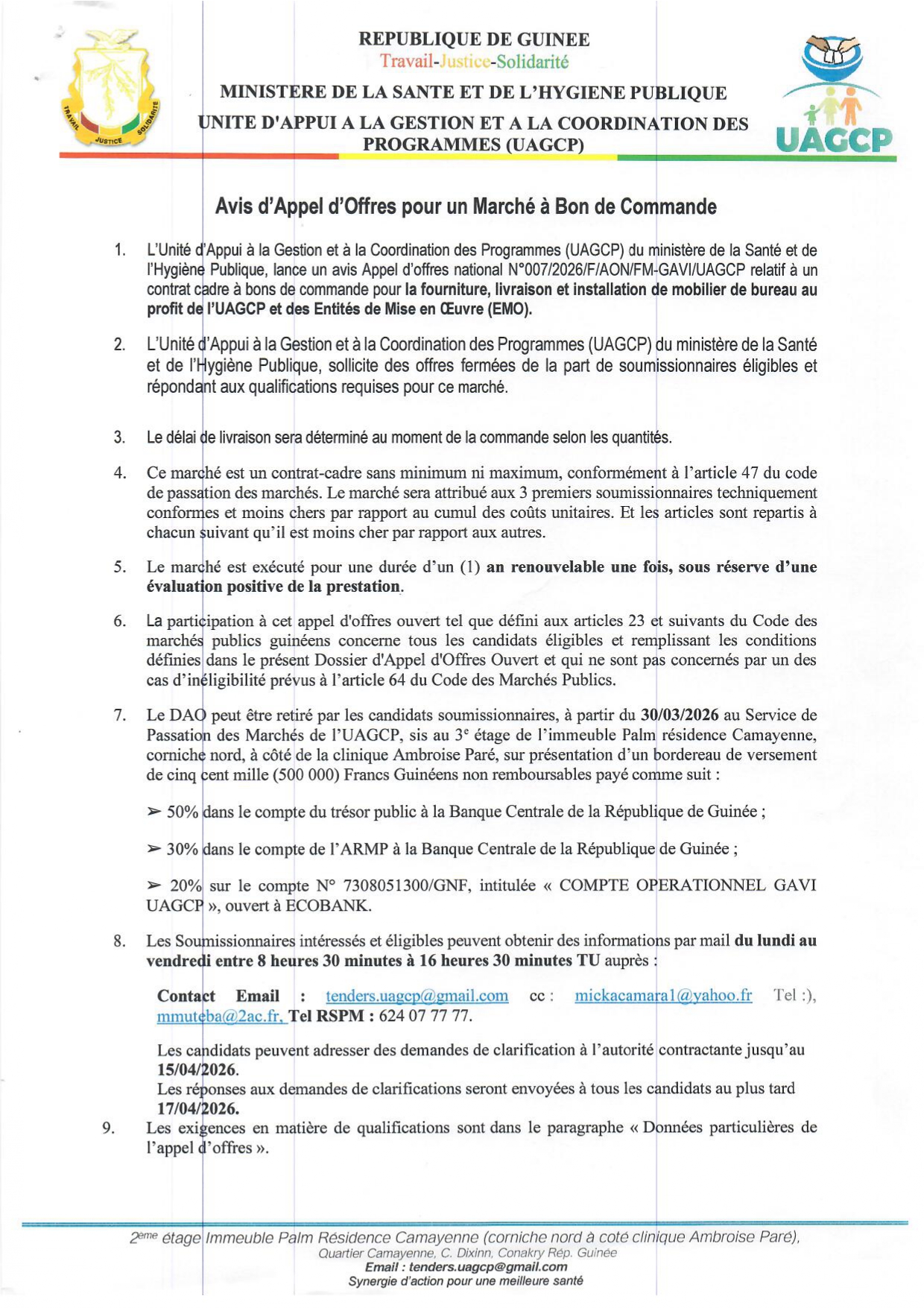 UAGCP – Appel d’offre pour la fourniture, livraison et installation de mobilier de bureau au profit de l’UAGCP et des Entités de Mise en Oeuvre (EMO)